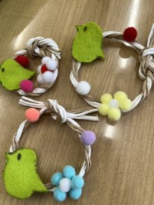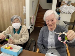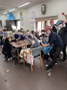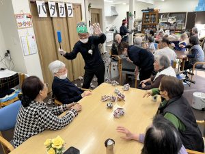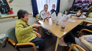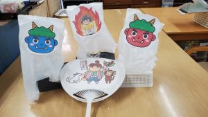 鬼退治ゲームでは鬼のイラストが描かれた袋をうちわであおいで飛ばし、